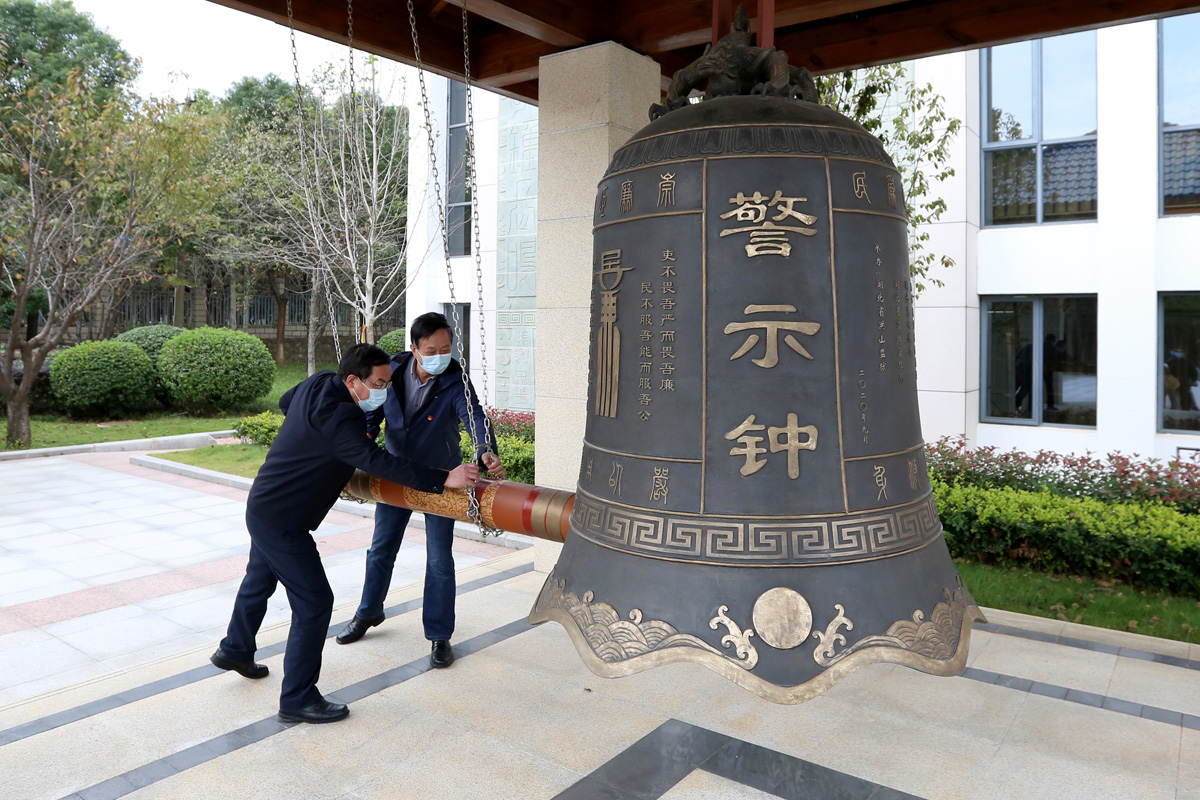 在基地廉政文化广场,党委书记、副所长肖庚富和党委副书记、纪委书记何长才共同敲响了廉政警示钟,三声警钟响起,提醒大家时刻自省自警,强化红线意识,增强底线思维,做到慎独慎微、慎始慎终,保持清正廉洁的政治本色。