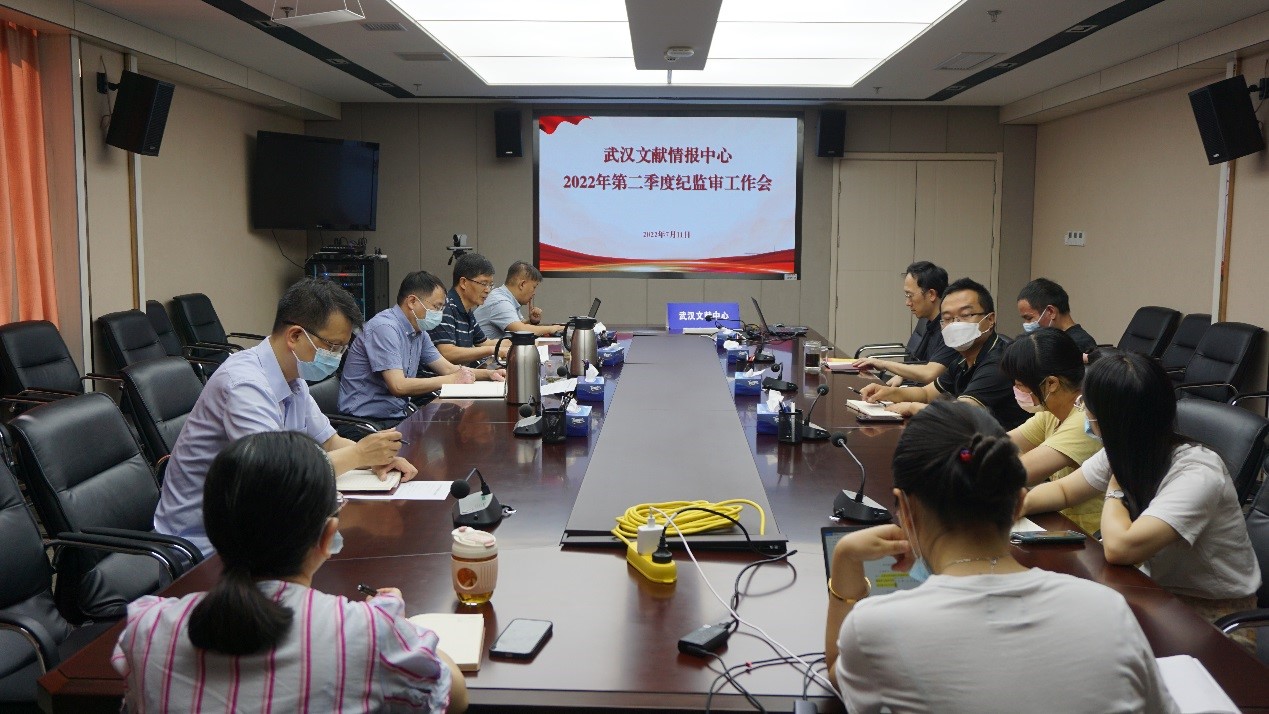 7月11日,中国科学院武汉文献情报中心召开第二季度纪监审工作会,党委书记、中心主任刘清,纪委委员、各支部纪检委员和纪监审干部参会,党委副书记、纪委书记刘德洪主持。