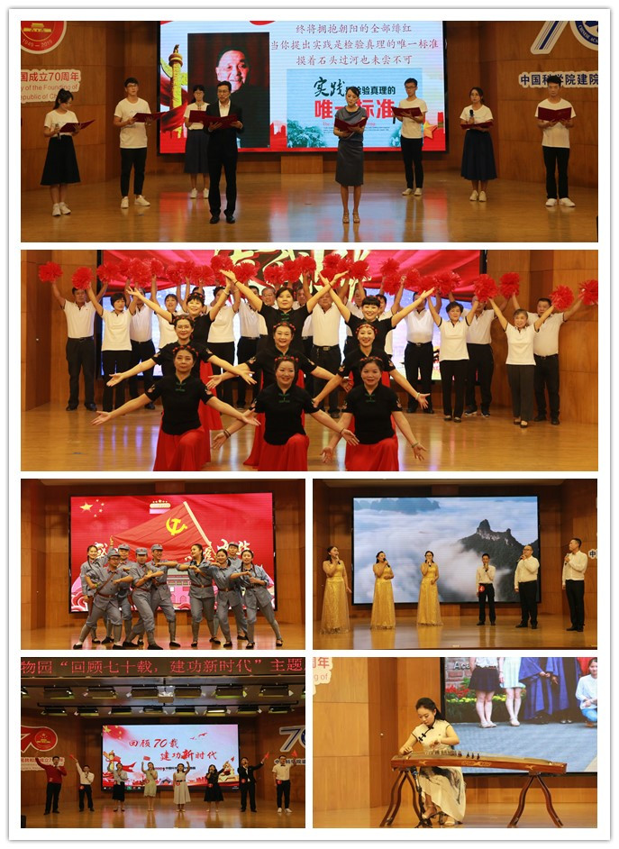 各党支部也联袂为观众们奉上精彩的表演。机关党支部和园艺中心党支部的小合唱《红星歌》展现出我们的赤子之心,科研党支部联合带来的诗朗诵《中国,我的中国》介绍了中国科技70年来的翻天覆地的变化,呈现了科学院人持之以恒的逐梦之路。科技开发党支部选送的小合唱《我的中国心》,表达了自己的爱国之心。水生植物科研党支部李文洋演绎的悠扬古筝《我爱你中国》,琴弦心动,筝音袅袅,让整个大厅都陶醉在曲韵悠扬的曼妙之境。离退休党支部表演的歌伴舞《爱我中华》将演出推向了高潮。