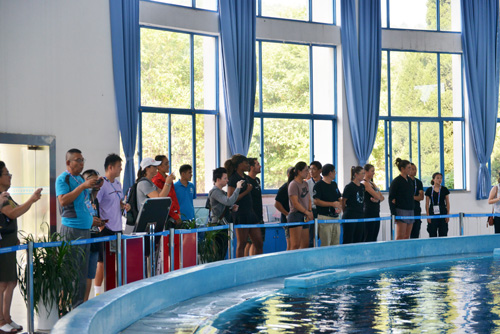 水生所前所长赵进东院士首先向各位球员致欢迎词并简要介绍了水生所及其在长江水生生物保护方面的工作。随后水生所综合办副主任(主持工作)副研究员、武汉白鱀豚保护基金会常务副秘书长郝玉江博士向来访球员详细介绍了长江豚类的生存现状、保护措施及取得的最新进展,最后向来访球员介绍了白鱀豚馆刚满百天的首头“第二代江豚”F9C,并观看了F9C出生和成长的视频短片。球员们被报告内容深深吸引,无不为白鱀豚的命运而唏嘘,又为中国在长江江豚保护方面所做的努力和成绩而鼓舞。听完报告后,选手们被邀请进入到白鱀豚馆饲养大厅来近距离探访这些水中精灵,球员们一进入饲养厅便被活泼好动的江豚们吸引住了,在水下底层观察窗前更是被他们灵动的身影和俏皮的表情所感动,并不时向白鱀豚馆的工作人员询问江豚的相关情况。