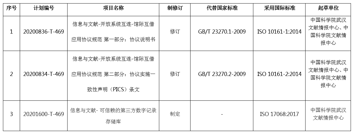 近日,国家标准化管理委员会下达了“2020年推荐性国家标准计划(修订)的通知(国标委发[2020]6号)”和“2020年第一批推荐性国家标准计划的通知(国标委发[2020]14号)”。由武汉文献情报中心作为第一起草单位、归口全国信息与文献标准化技术委员会管理的三项国家标准计划项目正式获批立项。具体项目清单如下: