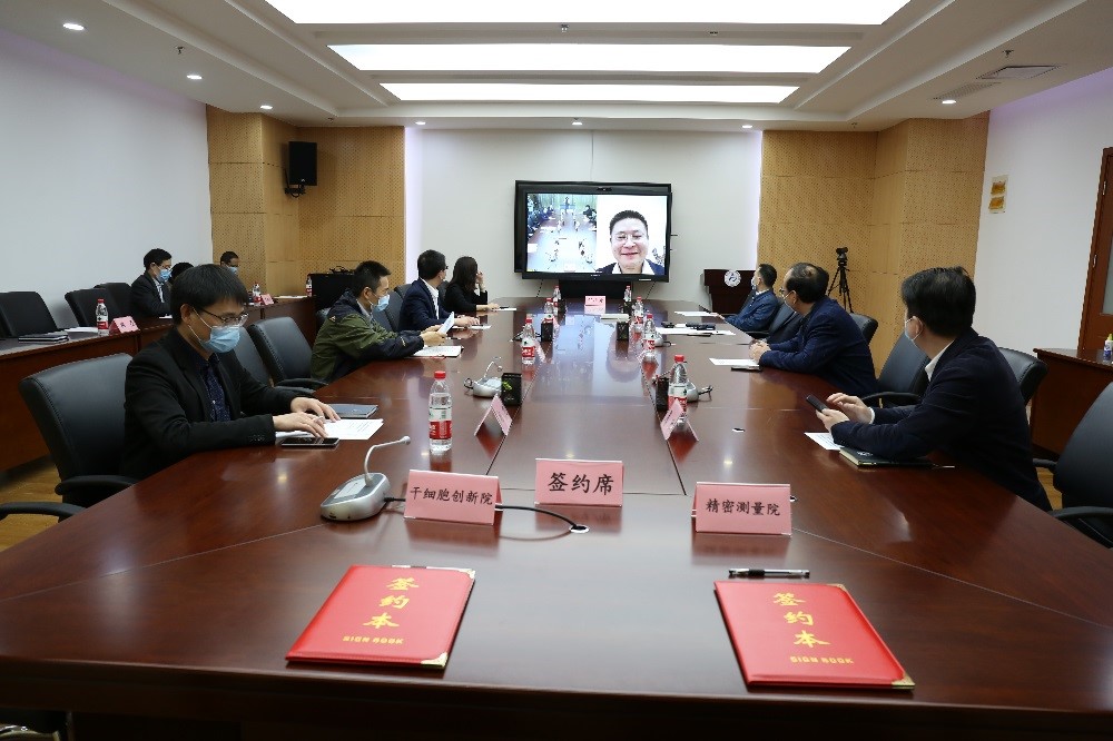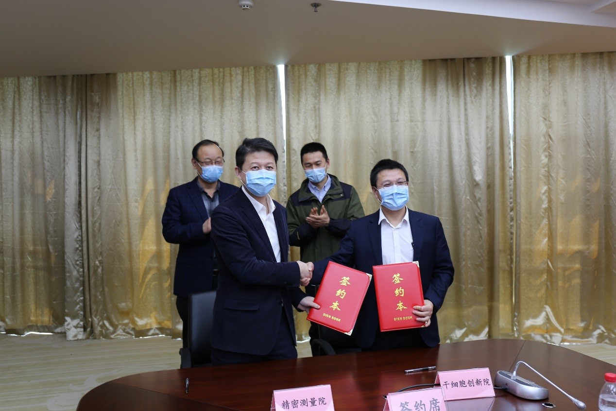 4月16日,精密测量院与干细胞创新院战略合作协议签约仪式在武汉举行。精密测量院罗志强院长、冯灿书记、柳晓军副院长、周欣副院长,干细胞创新院胡宝洋执行院长,中科院重大科技任务局资环生物处任小波处长,中科院应对新冠肺炎疫情科研攻关组武汉协调办公室沈毅主任等出席签约仪式。周欣副院长与胡宝洋执行院长代表双方签署了合作协议。签约仪式由冯灿书记主持。