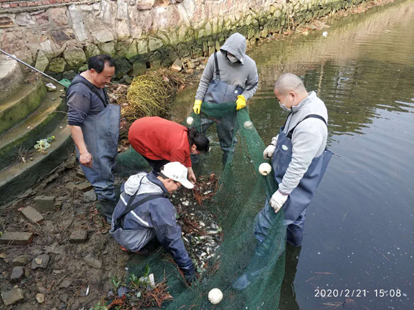 按照经验,每年春节前训练员都会储备大约15至20个工作日的饵料鱼,根据今年疫情形势的初步研判,他们比往年多储备了近一个月的饵料鱼。果不其然,随着疫情的加重,日常采购饵料鱼的白沙洲大市场也于1月底彻底关闭,这也就意味着今年春节一个多月的饵料鱼储备量也是远远不够的。负责饵料鱼采购工作的寇章兵同志心里暗暗下定决心,再难也要保证江豚不挨饿。幸亏鱼塘里还有人工养殖的饵料鱼,训练员们便决定下塘拉网。人手不够,便叫上食堂师傅一起帮忙。就这样在寒冷的冬日里,他们泡在在冰冷的池水中左挑右选,终于打捞起四百多斤鲜活鲫鱼,暂时缓解了10天左右的饵料鱼问题。但即使加上库存的冰冻?条鱼,也依然维持不了多久。寇章兵立刻将这一情况上报,并多方寻求帮助寻找货源。