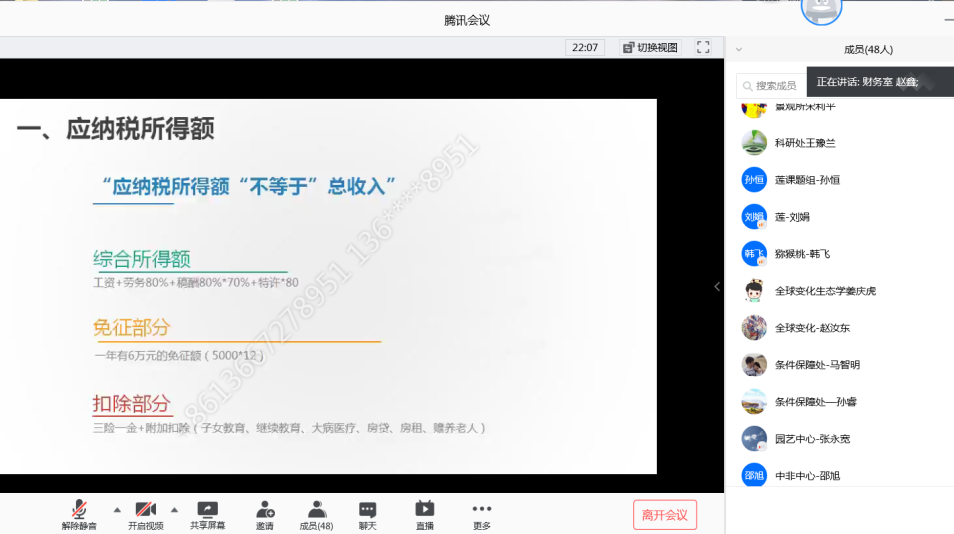 培训会上,赵鑫首先介绍了个人所得税的计算方式和附加扣除内容,同时举例说明了出现需要补税或者退税的原因。培训中,赵鑫语言生动风趣,举例经典、通俗易懂,通过现场与线上提问与交流,与会人员了解了个人所得税和个人年度汇算申报的必要性。