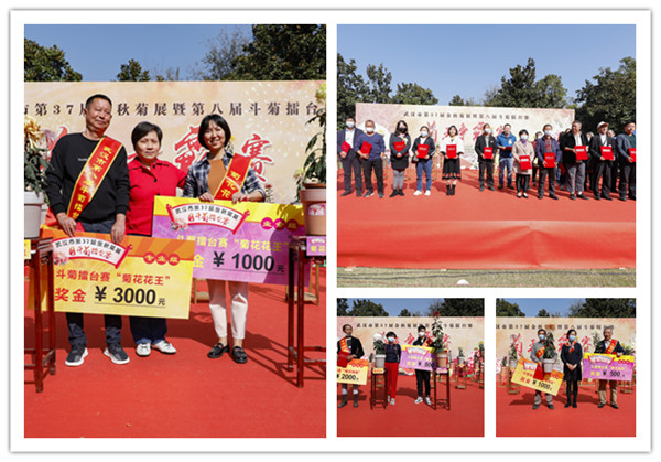 30路选手各显神通,30盆打擂菊花朵朵惊艳,比赛热烈紧张,精彩纷呈。经过激烈的评选,最终,“古刹金刚”凭借优异的表现一举夺魁,其养护者、青山公园高级园艺师刘庆东获得专业组菊花“花王”的奖项。紫阳公园园艺师陈顺启获得专业组菊花“榜眼”的奖项,汉水公园园艺师、两届武汉市斗菊擂台赛冠军得主丁建路再获菊花“探花”奖项。湖北省地质实验测试中心高级工程师董静则凭借一盆武汉本土菊花“盘龙春晓”斩获业余组菊花“花王”的奖项。青山公园园艺师张剑、市民选手程远惇分别获得业余组菊花“榜眼”和菊花“探花”的奖项。