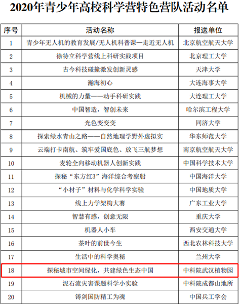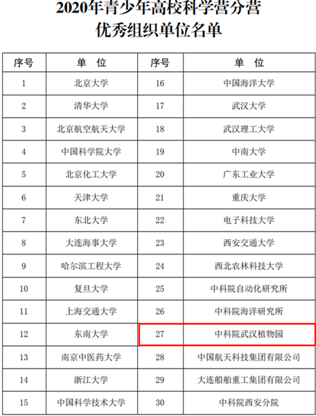 12月7日,中国科协青少年科技中心公布了2020年青少年高校科学营分营优秀组织单位名单和特色营队活动评选结果,武汉植物园因周密安排、精心组织、表现优异,荣获分营优秀组织单位的称号和特色营队活动奖。其中分营优秀组织单位是自2014年武汉植物园加入高校科学营大团体以来,首次获得此奖项。