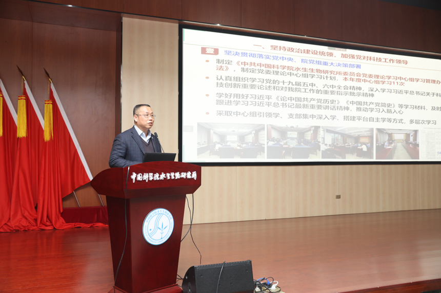会上,党委书记、副所长解绶启代表所领导班子作2021年度工作总结报告,代表党委作2021年度党建工作报告。工作报告主要从行政事务、平台建设情况、国重重组与十四五规划、科研项目争取及产出、财务状况等方面全面回顾了水生所2021年的各项工作情况,并展望了未来的工作重点。党建报告着重介绍了加强党对科技工作领导、落实党建工作责任、建设干部人才队伍、发挥战斗堡垒和党员先锋模范作用、全面推进党风廉政建设等方面的工作情况。