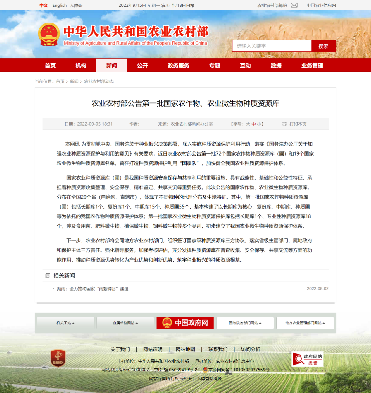 农业农村部关于第一批国家农作物、农业微生物种质资源库的公告