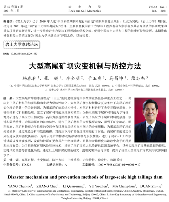 该文发表于2021年《岩土力学》第1期,主要介绍了团队在“十三五”期间对大型高尾矿库隐患治理,遏制重特大事故方面所作的研究工作。针对高应力下尾矿材料的细观结构和宏观力学特性演化、大型尾矿坝沉积规律及复杂条件下高尾矿坝的劣化理论等关键问题开展研究,建立了尾矿材料的三维重构模型、获得矿浆流动、淤积形态、尾矿料物理力学性质的空间分布以及夹层结构在空间内的分布规律;对高压下尾矿的强度准则进行了讨论、发现细粒尾矿更容易产生物理淤堵,且化学淤堵程度与溶液中离子的种类和浓度有关,并搭建了尾矿库重大风险评估监测系统平台,以便实现尾矿库基础数据的提取、实时风险预警等智能化功能。通过以上坝体劣化理论研究、溃坝灾害评估与预警,提升了我国大型高尾矿库筑坝与灾害防控水平。该文由杨春和院士、张超研究员、马昌坤博士、清华大学于玉贞教授、段志杰博士和中国安全生产科学研究院李全明教高共同撰写完成,其中杨春和院士为第一作者和通讯作者。