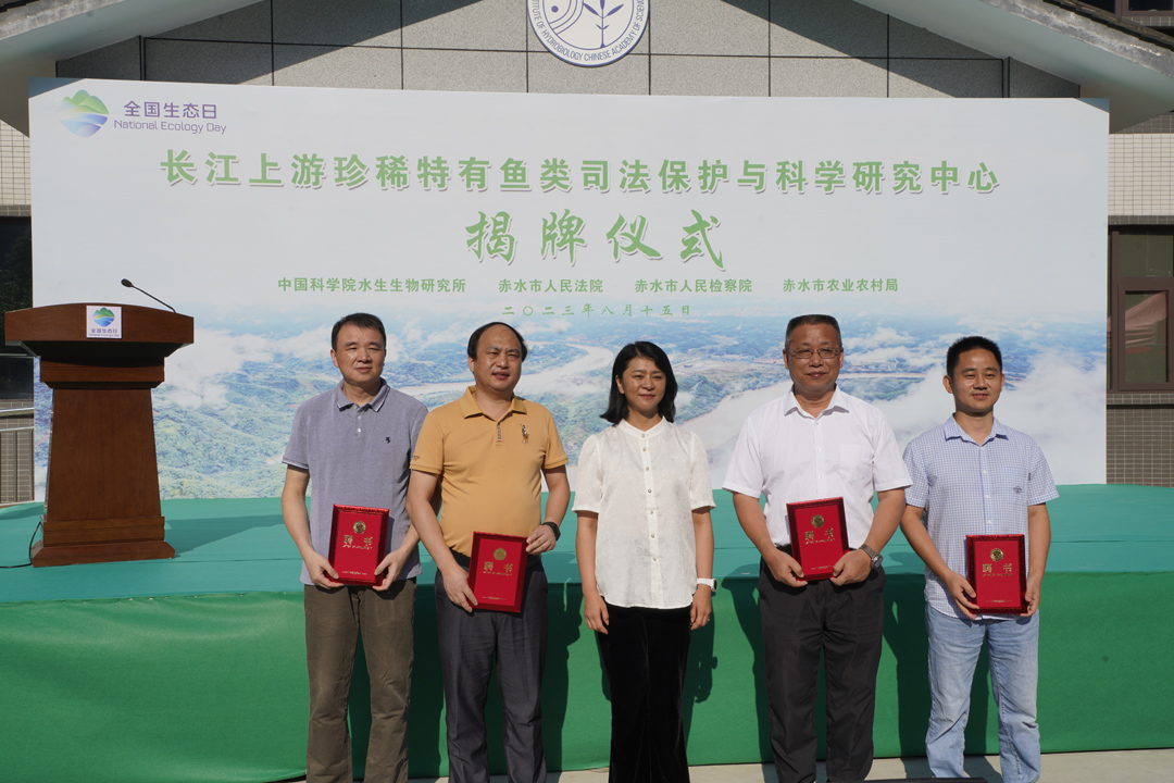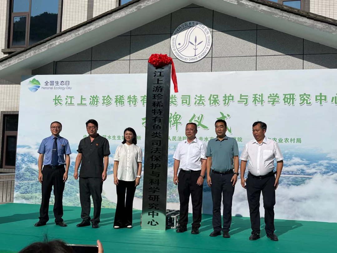 水生所党委书记解绶启,遵义市中级人民法院党组书记、院长卢飏,赤水市人大常委会主任李锋,赤水市人民法院党组书记、院长朱晓东,赤水市人民检察院党组成员、副检察长孙再文,赤水市农业农村局党组书记、局长赵中良共同为长江上游珍稀特有鱼类与司法保护科学研究中心揭牌。