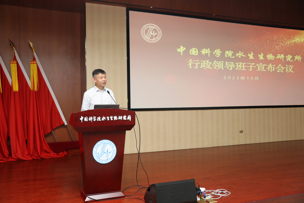 李海波宣读了中共中国科学院武汉分院分党组关于转发缪炜等同志职务任免的通知:缪炜同志任水生所所长(试用期一年);解绶启、胡炜同志任水生所副所长;徐军同志任水生所副所长(试用期一年);免去殷战同志水生所所长职务,保留正局级。