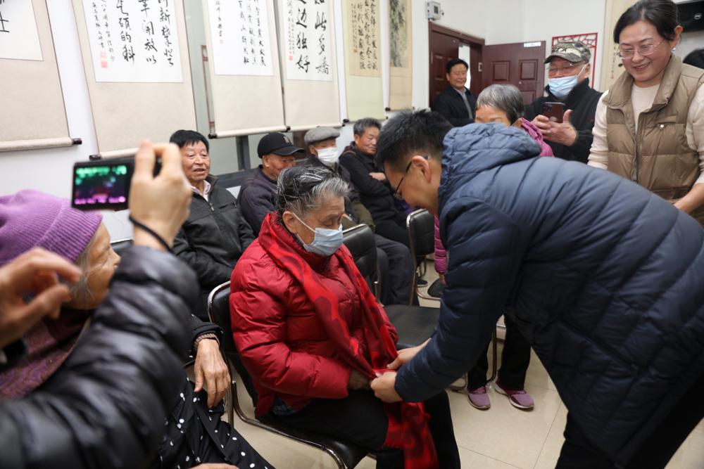 离退休活动室里,寿星们欢聚一堂,喜笑颜开。所领导们为寿星们一一佩戴上福寿围巾,送上祝寿礼金。离退休管理干部杨文眷用PPT的形式展示了寿星们年轻的风采,再现了他们与水生所一起走过的光辉岁月。
