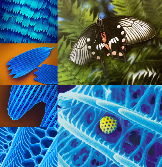 《蝴蝶翅膀磷粉》作品取自蝴蝶翅膀一小块,粘于样品台、喷金后在扫描电子显微镜下观察,拍摄倍数由低到高,可见磷片的微观结构和磷片上的花粉粒。蝴蝶色彩斑斓,其奥秘就源于蝴蝶翅膀上的磷粉。在电镜下看,磷粉是一片片的,像羽毛扇一样,密密麻麻地有序排列在翅膀的上下两面,为蝴蝶织成了鲜艳的“彩衣”,可以迷惑敌人,躲避攻击,吸引异性,还可以吸收和散发热量、维持体温来适应环境变化。它们是大自然创造的奇迹,也是我们欣赏和赞美的对象。