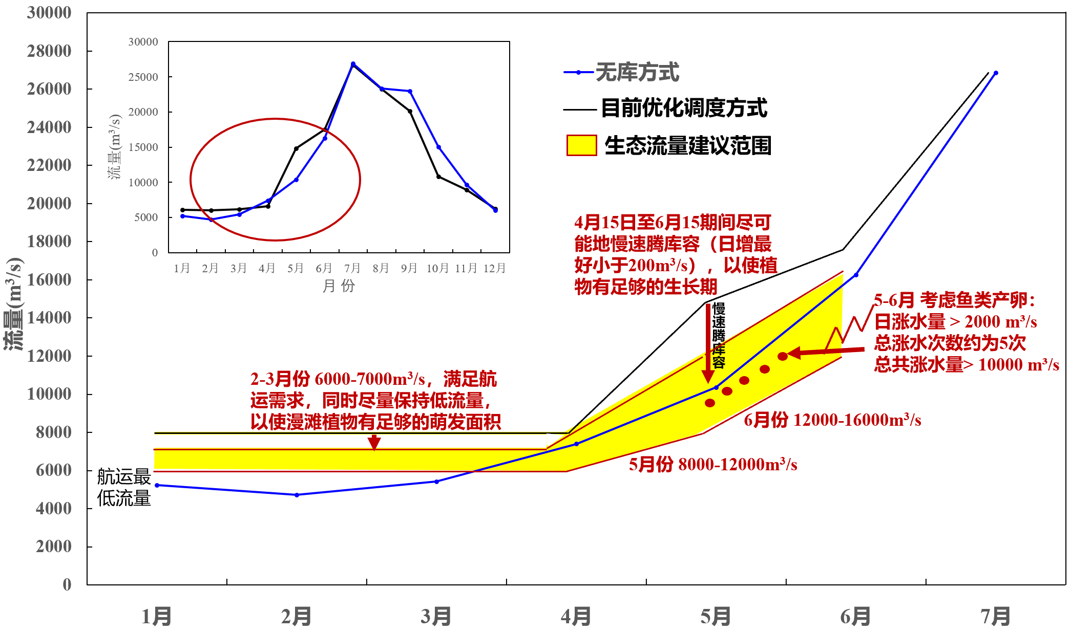 长江模拟器水文-水动力-食物网模块,模拟了三峡水库下泄流量周年动态、栖息地与中游干流三个江段鱼类资源和江豚数量的定量关系。根据模拟结果,确定了面向鱼类和江豚保护的三峡水库调度最佳参数,即:2-3月流量为6000~7000 m3/s,满足航运需求(航运最低需求为6000 m3/s),同时尽量保持低流量,以使漫滩植物有足够的萌发面积;4月7000-8000 m3/s 、5月8000~13000 m3/s、6月13000~18000 m3/s,4月15日至6月15日期间尽可能地慢速腾库容(日增最好小于 160 m3/s),以使植物有足够的生长期;5-6月制造洪峰以满足四大家鱼产卵需求,日涨水量大于2000 m3/s,涨水次数约5次,总涨水量大于10000 m3/s。模拟结果还显示:恢复河漫滩面积至关重要。相关建议得到长江水利委员会重视,相关成果获2023年湖北省科学技术进步一等奖。