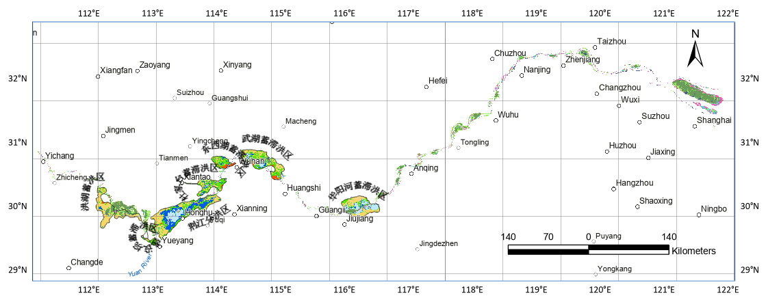 长江模拟器-岸线质量评估模块,阐明了近50年长江河漫滩演变及其驱动代表性水生生物长江江豚种群濒危的机制,制定了长江岸线质量评估指数体系,评估了不同历史时期长江岸线质量状况,构建了结合防洪、航运、粮食安全等多目标融合的长江岸线综合保护对策。提出了以子堤拆除、局部微水文改造等为手段的长江中下游大堤内河漫滩保护和恢复方案(~3024平方公里)。而恢复这些河漫滩,每年可固定削减总氮19000吨、总磷2400吨,增加110000吨渔产潜力。作为长江生物多样性恢复的指标之一,这个渔产潜力可以支撑约2000头长江江豚生存,从而实现将江豚的干流种群数量恢复至2006年以前的水平。相关的研究结论在Science等杂志发表,推动河漫滩质量演变结果在农业农村部《长江流域渔业生态环境公报》发布。