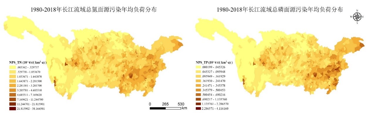 图6 模拟1980-2018年长江流域总氮、总磷面源污染年均负荷分布