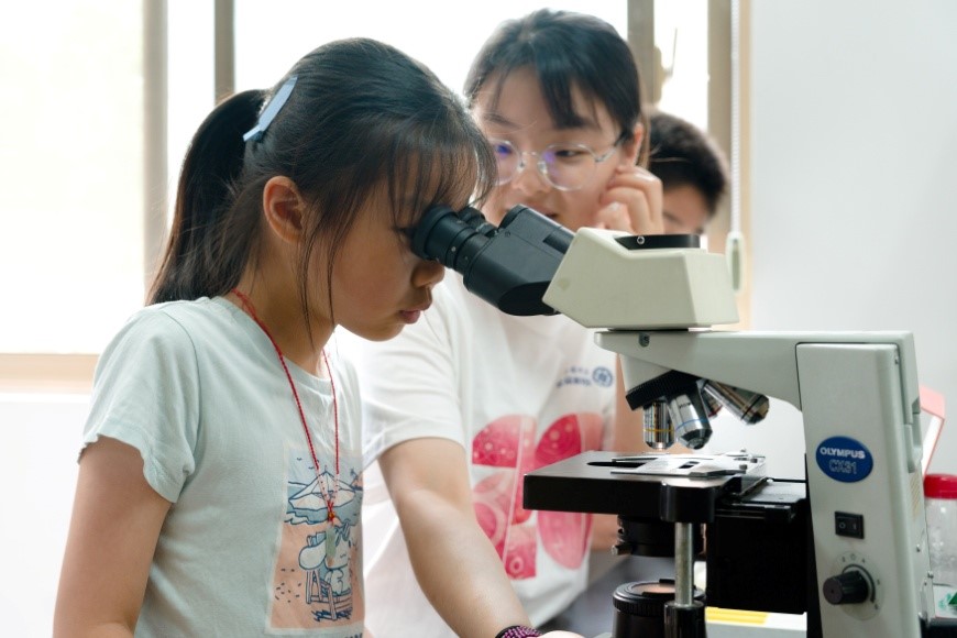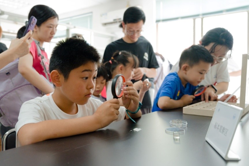 在互动实验课程中,孩子们跟随研究生志愿者,共同开展了手掌菌实验,学习了实验原理和观察记录方法。在病毒标本馆中,大家进一步见识到多种多样的病毒3D彩打模型、电镜图片等,了解了病毒的历史沿革,以及科学家为抗击病毒而发明的“武器”。此外,孩子们积极学习了如何使用显微镜观察人体组织、动物及植物有关标本切片,还使用放大镜观察了蜱虫、蚊子等滴胶标本,直观地体会到微观世界的内在奇妙,感受生命的绚丽壮美。