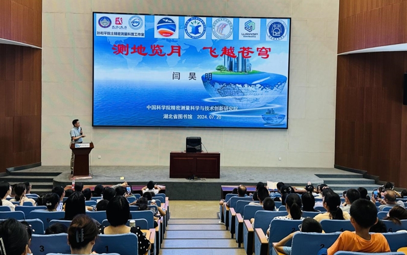 7月20日,精密测量院研究员闫昊明做客“荆楚科普大讲堂”,作为主讲嘉宾在湖北省图书馆作了一场题为《测地览月 飞越苍穹》的专场科普报告。此次报告是荆楚科普大讲堂2024年暑假期间走进湖北省图书馆的系列报告之一,旨在普及航空航天、大地测量和天文学等前沿科学知识,大力传播科学精神,激发公众对科学探索的热情。报告吸引了近300名学生和公众到场。