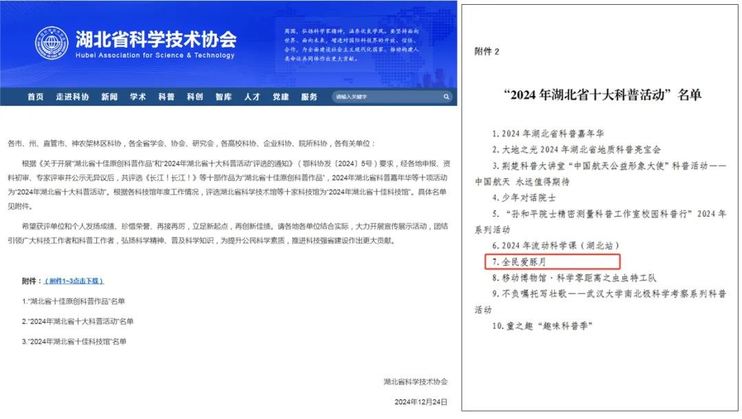 12月24日,湖北省科学技术协会公布了“2024年湖北省十大科普活动”,由中国科学院水生生物研究所等发起的“全民爱豚月”上榜。