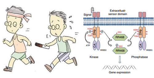 双组分信号转导系统由组氨酸激酶( Histidine Kinase, HK)和反应调节蛋白( Response Regulator, RR)组成。如同接力赛中,队员之间传递接力棒般,它们之间通过磷酸基团的传递实现信号的转导,磷酸化后的应答调节蛋白可以调控一些特殊基因的表达。HK蛋白是细菌的感应器,通过感知不同的环境条件从而做出相应的响应。