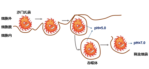 早前,研究人员发现,鼠伤寒沙门氏菌以胞吞的方式入侵宿主细胞。沙门氏菌双组分系统通过感知环境pH的变化,在沙门氏菌的感染及释放过程中发挥了重要的作用。在这个过程中,双组分系统中的组氨酸激酶会实现不同功能的切换,但是具体的分子机制并不清楚。