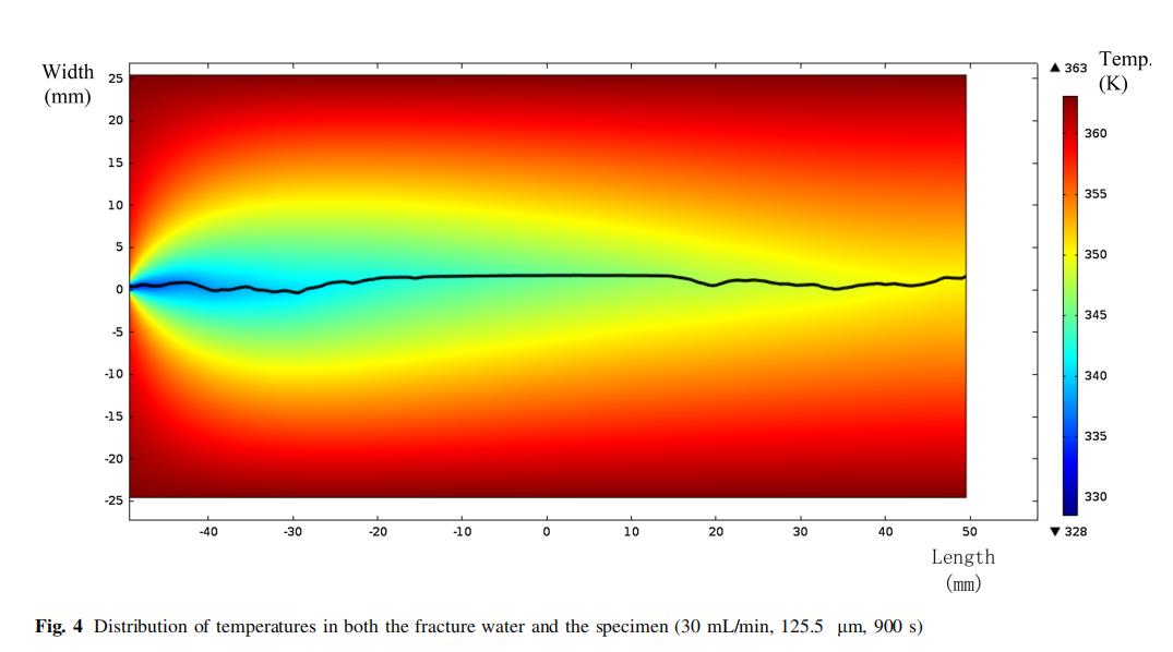 花岗岩岩块与裂隙中的温度分布(左侧注入流量30mL/min,裂隙开度125.5微米,时间900s)