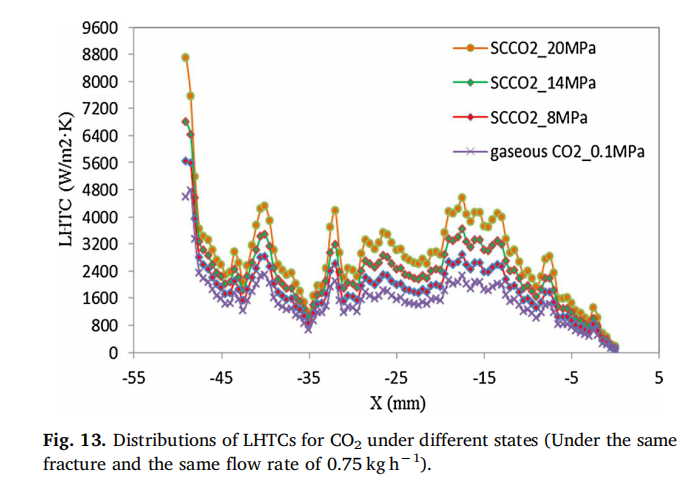 研究团队自行研制了新型高温裂隙岩体流动换热力学耦合测试系统,对花岗岩单裂隙中水在不同围压、不同围温以及不同流量条件下的流动换热进行了系统的实验研究;利用实验数据对现有裂隙总体换热系数公式进行了验证筛选,发现某些常用公式在流量较高条件下出现数值振荡甚至负值等不合理情况,提出了总体换热系数(OHTC)的一个简化公式有效解决了这一问题。此外,有些换热系数公式在推导中为了容易解析而假设内壁面温度沿径向是常量也是不合理的,这将导致现在(±R,0)处存在温度不连续的问题。基于格林函数法提出了一套新的关于总体换热系数的解析方法,可有效避免这些问题,给出了径向温度是0-3次多项式函数分布时具体解析解。开发了裂隙流动换热数值分析模型,成功实现了裂隙与岩石相差2个数量级时的数值建模问题,模拟结果与实验数据吻合良好。提出用局部换热系数(LHTC)表征干热岩裂隙的局部换热特征,发现裂隙张开度较小时通常局部换热系数较大,裂隙的局部起伏度(代表粗糙性)与局部换热系数呈负相关关系,即LHTC在裂隙凹进处较大,而在凸起处较小。裂隙光滑处LHTC较小,而粗糙处则较大,给出了LHTC与起伏度的拟合关系。基于该模型对水和二氧化碳的流动换热规律进行了模拟研究,发现其他条件相同条件下,气态二氧化碳和气态水的总体换热系数和局部换热系数都随着流量的增加而增加,气态二氧化碳的OHTC及LHTC总是比气态水的小,超临界水换热系数优于超临界二氧化碳。就二氧化碳而言,紧相比松相的换热能力更优。