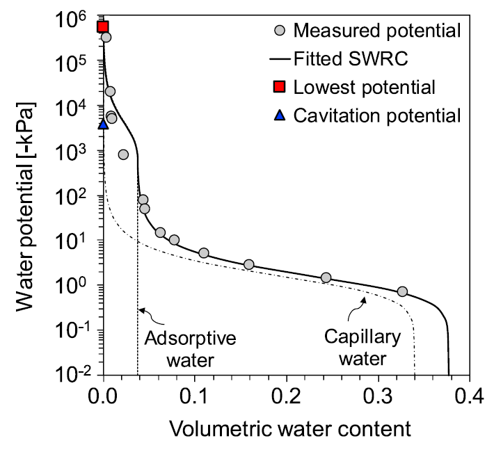 土水之间的相互作用对土体许多宏观的力学响应、物质运移、和传导行为起到决定性影响,而土水特征曲线就是描述这种非饱和土水相互作用的最重要本构之一。在诸多土水特征曲线的模型中,最低基质势能作为土水特征的重要参数,决定了土体在极低含水量条件下,土体颗粒对水分子的吸附能力。现有的模型都无法标书这一特征参数,或用人为给定的?106kPa,或用较低含水量的吸力线性外插值等。同时,现有的试验技术和手段,既很难实现土体的绝对干燥(尤其是黏土),也很难在物理上微观探测极微量水分子的吸附过程。