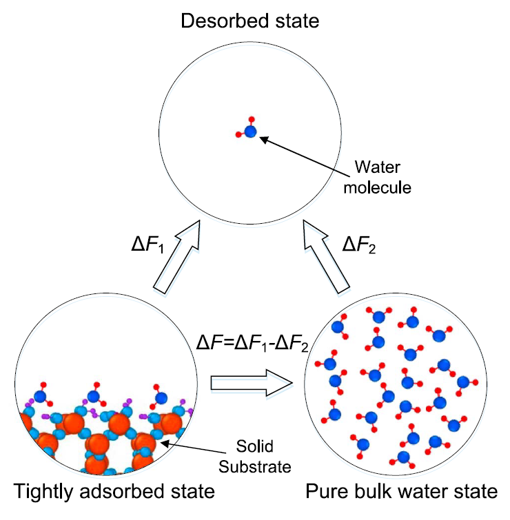 图2:矿物表面与水分子体系的不同能量状态,以及确定体系自由能变化的示意图