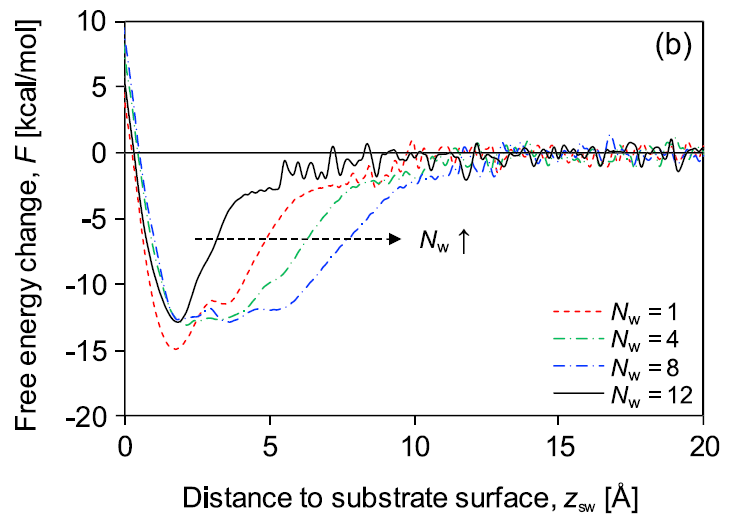 图3:矿物表面随着吸附水分子不断增加,体系自由能的变化过程模拟
