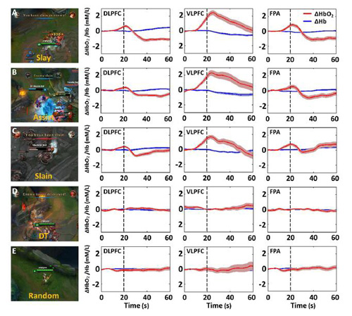 为探究电子游戏障碍可能的神经机制,武汉物数所雷皓研究员团队与武汉国家光电研究中心龚辉教授团队合作,利用功能近红外光谱技术(fNIRS) 实时监测了志愿者在玩目前全球最流行的在线竞技类游戏《英雄联盟》期间的脑功能活动。采用事件相关的数据分析方法,对被试者在游戏过程中背外侧前额叶(DLPFC)和腹外侧前额叶(VLPFC)等额叶皮层区的实时功能活动进行了提取与分析。