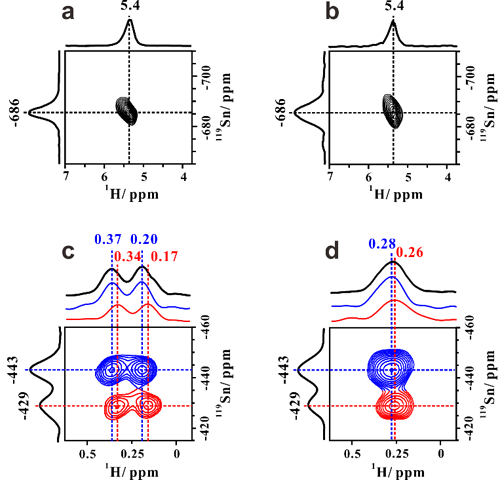 图1. Sn-β分子筛上锡物种的质子检测1H/119Sn二维相关固体NMR谱图