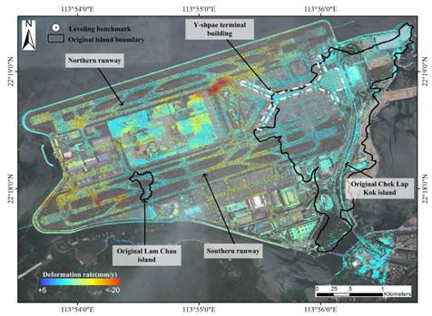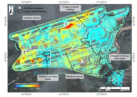 研究结果表明,香港国际机场和香港科学园部分填海区域存在较为明显的不均匀地面沉降(3毫米/年~20毫米/年),监测点密度得到大幅提高(约36万个/平方公里),是PSI方法的8倍左右,如图1。此外,相比现有DSI方法,该改进的DSI方法解算效率得到显著提高(目标点识别和相位优化分别提高了约30倍和20倍)。