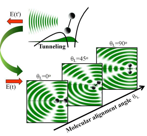 分子自层析成像原理图。飞秒强激光驱动下气相分子发生隧穿电离,当激光电场反向时,隧穿电离电子波包返回分子的双原子中心附近并与之发生相互作用,形成光电子衍射图案。通过解析不同分子轴取向下的光电子谱可以直接提取出分子核间距信息。