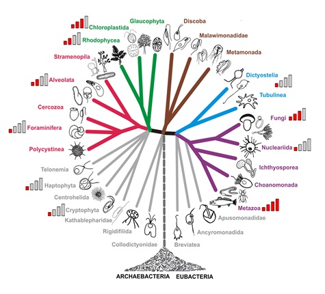 图1. 形态种在真核生物中的广泛分布(柱状图表示各真核生物类群中形态种报道数目的多少,基于Web of Knowledge文献检索结果整理;图修改自Adl等,2012)。
