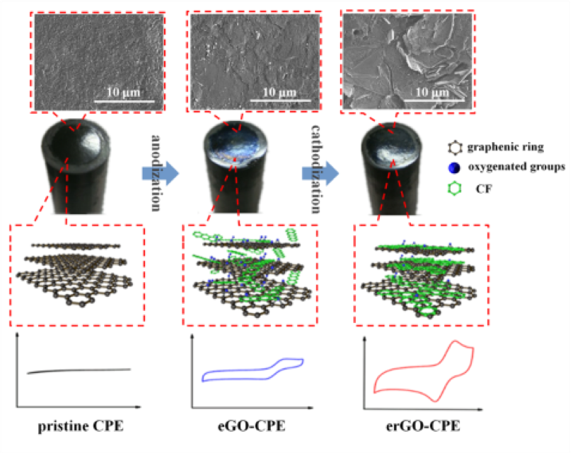 碳素电极的电化学活化是电分析化学中一种经典的电极修饰技术,即通过极其廉价而简便的处理方法使基础电极获得多种性能的显著提升。该操作已在电化学(生物)传感领域被广泛作为一种器件预处理方法研究和沿用。人们虽然从多方面对其活化机理进行了逾半个世纪的探究,迄今多种学说仍无法统一认识。本研究选取石墨作为电极模型材料,深入探究了活化处理前后电极表面的形貌、化学属性变化。实验通过多种原位或异位亚显微结构观测及多种光谱学表征发现:在经典的电化学活化过程中,石墨晶格会发生解聚并在电极表面原位生成一层氧化石墨烯分子薄膜。该薄膜随后可被还原,原位转化为还原氧化石墨烯分子层。配合电化学表征实验确认,原位形成的(还原)氧化石墨烯薄膜正是赋予活化后电极高性能的物质基础。该结论与此前报道的电极表面结构变化、活性基团增加、表面物质转化等观点均能相融,是目前最为综合性的一种解释。同时,该认识可用以指导电极表面化学及电化学性质的理性定制,真正将碳素电极的活化处理演化为一种电化学(生物)传感界面可控修饰的新型工艺。