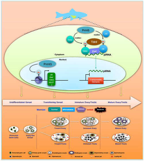 中国科学院水生生物研究所研究人员利用 CRISPR/Cas9 技术,在斑马鱼中敲除了prmt5,并对其在体生物学功能和机制进行了分析。prmt5缺失的斑马鱼能够发育并部分成活,然而其成体呈现出全雄但不育的表型。经过系统分析发现:prmt5不仅能够对斑马鱼性腺中组蛋白H3和H4的特异精氨酸位点进行甲基化修饰,而且还对Piwi信号通路中的关键蛋白Vasa和Zili的精氨酸进行甲基化修饰。进一步通过质谱分析技术,鉴定了Vasa和Zili中prmt5介导的精氨酸甲基化修饰特异位点。prmt5缺失后,Vasa和Zili特异精氨酸位点不能发生正常的甲基化修饰,进而影响斑马鱼性腺细胞的正常迁移,最终导致性腺细胞凋亡。该研究表明prmt5在脊椎动物性腺发育过程中扮演着十分重要的角色。