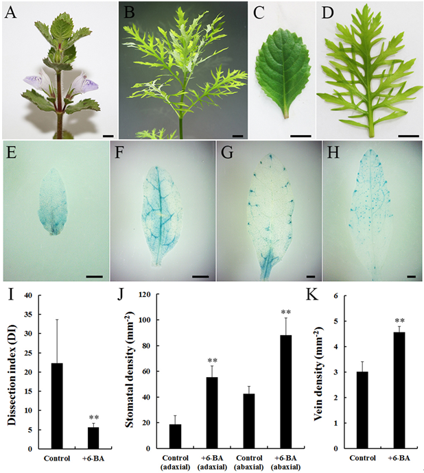 I-K:细胞分裂素处理后的叶形特征变化。I:叶片细碎化指数(DI)。J:气孔密度。K:叶脉密度。