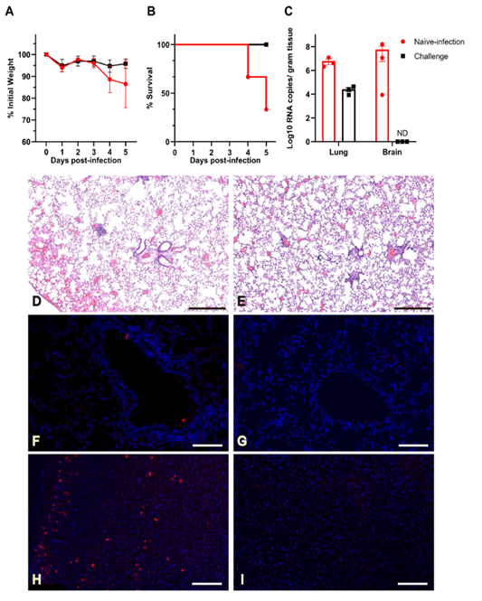 图1.预先暴露于SARS-CoV-2可保护小鼠免受严重肺部感染。存活小鼠及初次感染小鼠在高剂量SARS-CoV-2感染后的体重变化情况(A);生存率情况(B);主要器官病毒载量情况(C);肺组织病理变化及肺组织与脑组织病毒抗原表达情况:初次感染(D,F,H),再次感染(E,G,I)。