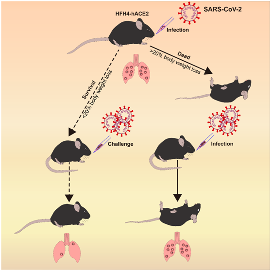 这项研究发现HFH4-hACE2转基因小鼠模型对SARS-CoV-2易感,小鼠肺组织是病毒的主要靶器官并且能部分模拟COVID-19的病理变化;预先暴露于病毒能保护小鼠免受严重的肺部感染(图2)。该模型的成功建立给疫苗及抗病毒药物提供了简便,高效的测试平台,为新冠肺炎疫情的控制提供了有力的科技支撑。