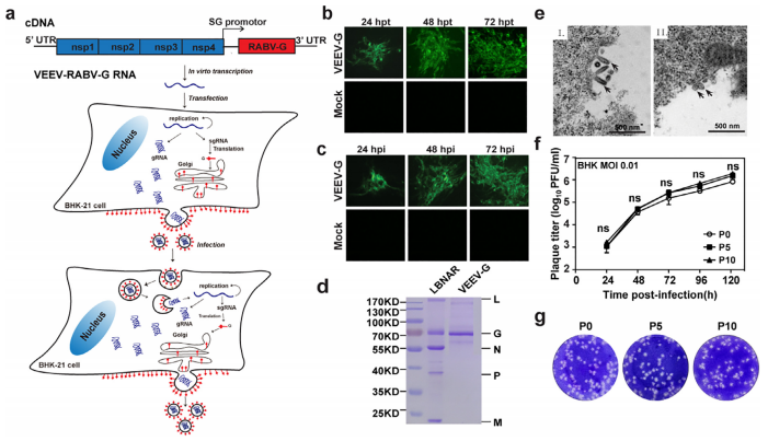 图1. VEEV-RABV-G重组病毒鉴定。a:VEEV-RABV-G重组病毒产生及感染示意图;b:VEEV-RABV-G转染细胞后不同时间点IFA检测;c:VEEV-RABV-G病毒感染细胞后不同时间点IFA检测;d:纯化的VEEV-RABV-G重组病毒和LBNAR病毒SDS-PAGE电泳分析;e:VEEV-RABV-G和LBNAR感染细胞后电镜观察;f:传代后的病毒生长曲线比较;g:传代后的病毒噬斑比较。