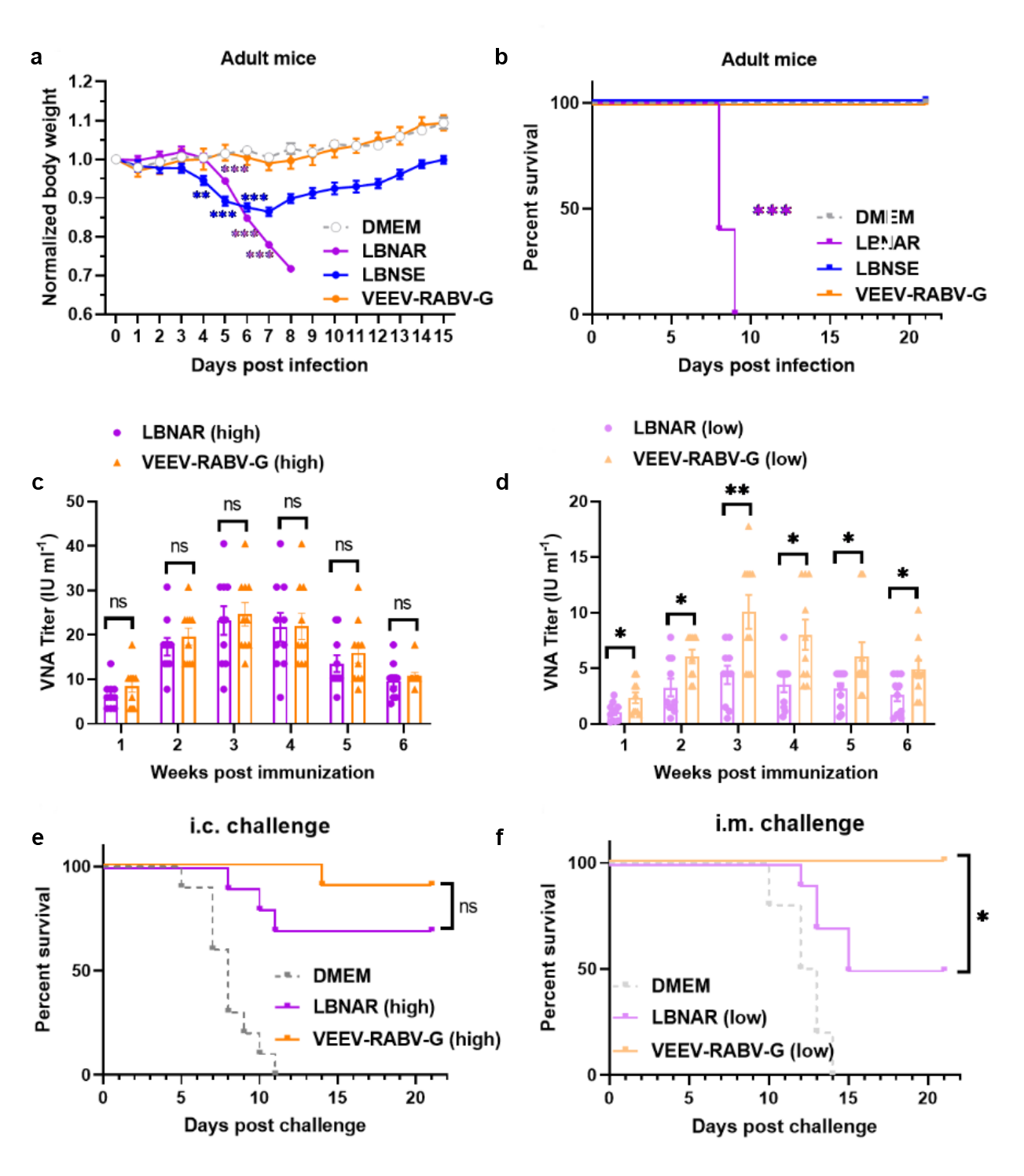 图2. VEEV-RABV-G重组病毒的安全性和免疫保护评价。a:VEEV-RABV-G、LBNAR、LBNSE、DMEM对照组颅内感染小鼠后体重变化;b:病毒颅内感染后小鼠存活率;c:高剂量(2×105 PFU)VEEV-RABV-G、LBNAR免疫后小鼠血清中和抗体效价;d:低剂量(2×103 PFU)VEEV-RABV-G、LBNAR免疫后小鼠血清中和抗体效价;e:高剂量免疫后狂犬病毒颅内攻毒后小鼠存活率;f:低剂量免疫后狂犬病毒肌肉注射攻毒后小鼠存活率。