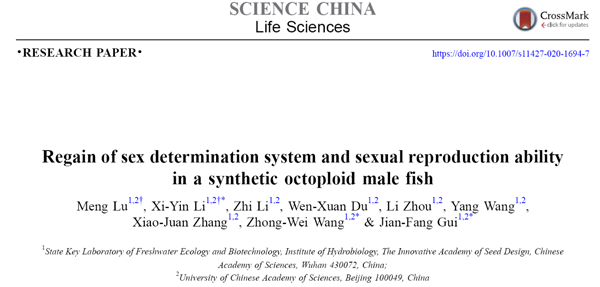 6月10日,中国科学院水生生物研究所桂建芳院士团队,在SCIENCE CHINA Life Sciences(《中国科学:生命科学》英文版),在线发表了题为“Regain of sex determination system and sexual reproduction ability in a synthetic octoploid male fish”的论文。