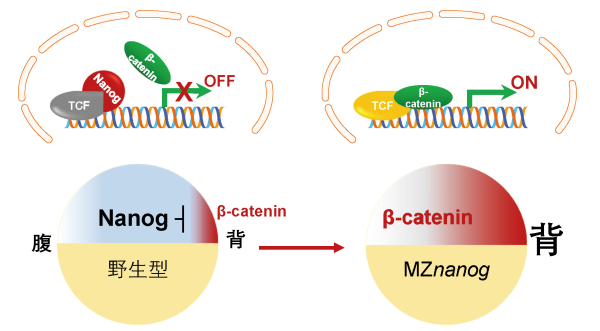 背部组织中心(dorsal organizer)在胚胎体轴建立和早期胚胎发育过程中扮演着重要的角色。已有的研究表明,母源提供的β-catenin在胚胎背侧的细胞中大量入核,激活背部组织中心基因boz、chd等的表达,诱导背部体轴发育。然而,胚胎的非背侧细胞中仍然存在少量的β-catenin入核,其转录活性是如何被精确控制的,尚属于学术界的难题。