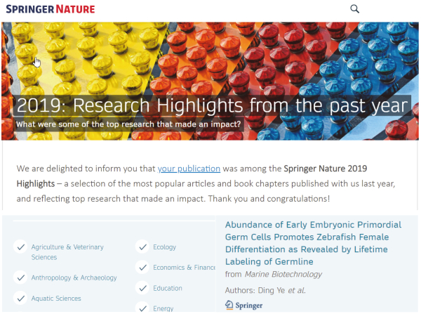 图2 叶鼎等发表的Marine Biotechnology论文入选Springer Nature出版社2019年度的亮点论文