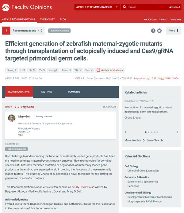 近期,该团队优化了鱼类“借腹怀胎”的技术流程,首次建立了鱼类基因编辑配子“借腹怀胎”的新技术,实现了高效快速获得致死基因的母源合子突变体(张峰华等,Journal of Genetics and Genomics, 2020),相关论文被国际学术论文评估机构F1000 Prime专门推荐(图3)。