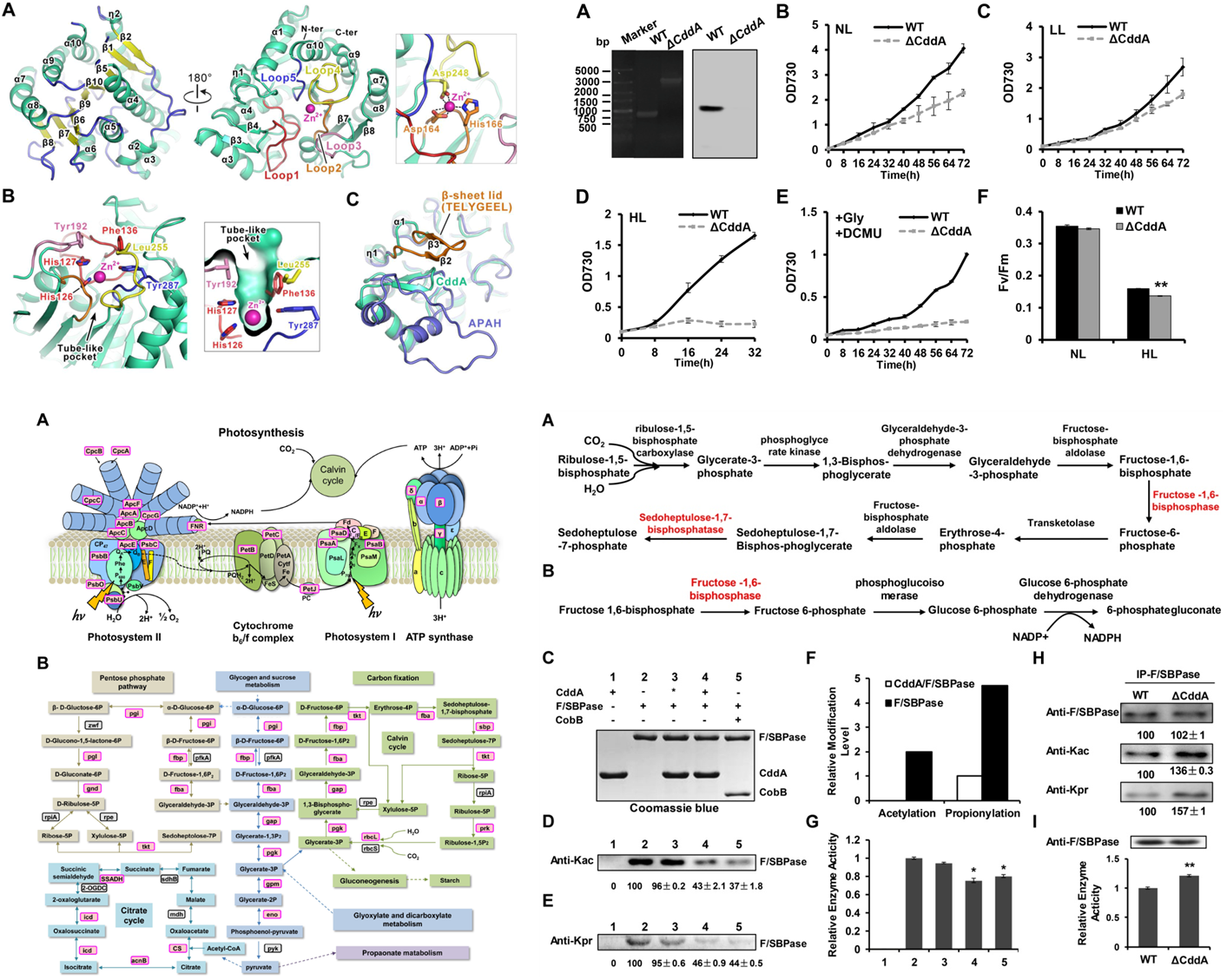 中国科学院水生生物研究所赵进东研究员和葛峰研究员团队前期在蓝细菌中系统性地鉴定到20多种不同的蛋白质翻译后修饰,揭示了这些可逆的蛋白质翻译后修饰在光合系统以及其他重要的生物学过程中发挥着重要的调控作用(PNAS,2014,111(52):E5633-E5642)。在此基础上,该研究团队通过生物信息学分析发现,在蓝细菌Synechococcus sp. PCC 7002中存在一个可能的去酰基化酶CddA (cyanobacterial deacetylase/ depropionylase),深入的功能实验表明,该酶具有显著的去乙酰化和去丙酰化酶的活性;同时,该基因敲除后导致藻细胞的生长速率显著减慢,并且光合作用过程也受到显著地影响,提示CddA调控的底物蛋白修饰可能参与了蓝细菌中重要的生物学进程。为了进一步揭示蓝细菌中去酰基化酶CddA的功能与作用机制,该研究团队与中山大学刘迎芳教授合作解析了CddA的三维结构。通过结构分析发现,该酶由10个β折叠和12个α螺旋结构组成,并形成一个管状口袋结构,能够与底物蛋白以及锌离子结合进而发挥催化作用;通过点突变实验证实了维持酶活性的关键位点。为了鉴定CddA的作用靶标,该研究团队利用高通量质谱技术系统地鉴定了蓝细菌中的丙酰化和乙酰化修饰蛋白,这些修饰蛋白广泛分布于光合作用过程与其它重要的代谢通路中。进一步功能实验发现,在碳代谢通路中的果糖/景天庚酮糖-二磷酸酶(F/SBPase)是CddA酶的靶标底物之一,CddA通过去除F/SBPase蛋白的乙酰化和丙酰化修饰,进而调控F/SBPase的酶活性。该研究首次发现并揭示了去酰基化酶CddA的三维结构及其在蓝细菌中的功能与作用机制,为进一步研究酰基化修饰在光合生物中的功能提供重要的理论基础与新的研究思路。