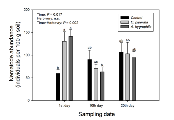 武汉植物园入侵生态学学科组博士生刘佳在黄伟研究员和河南大学丁建清教授的指导下,以入侵植物空心莲子草(Alternanthera philoxeroides)为实验材料,开展温室盆栽实验,施加三种不同的昆虫取食处理[无昆虫取食、专食性昆虫莲草直胸跳甲(Agasicles hygrophila)取食、广食性昆虫虾钳菜披龟甲(Cassida piperata)取食],并在处理结束后的第1、10和20天测定盆栽土的土壤线虫群落结构。结果表明,昆虫取食处理会显著提高空心莲子草根围土壤线虫的丰度,特别是植食性线虫,但是这种促进作用仅出现在处理结束后初期。随着时间推移,这种影响逐渐减退,并在后期完全消失。此外,专食性昆虫和广食性昆虫的影响并不存在显著差异。该研究表明在评估入侵植物的影响时,需要同时考虑地上和地下生物群落,这对于更深入全面地探究和理解植物入侵的影响具有重要的意义。