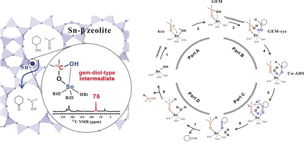 Sn-Beta分子筛上偕二醇中间体的NMR观测(左)和基于偕二醇中间体的MPVO催化反应循环过程(右)