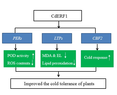 进展二:以上述筛选获得的耐寒和低温敏感狗牙根种质为材料,低温处理后进行RNA-Seq分析,鉴定到一个受低温显著诱导的基因CdERF1,且其在抗寒种质中表达水平更高。CdERF1基因编码的蛋白定位于细胞核内,具有转录激活活性。异源表达CdERF1能显著增强转基因拟南芥的耐寒性,具体表现在叶片电解质渗透率(EL)、丙二醛(MDA)、ROS含量的显著降低,及SOD、POD酶活性的明显升高。而利用病毒诱导基因沉默(VIGS)方法抑制狗牙根内源CdERF1的表达,则导致狗牙根对低温胁迫更加敏感。进一步以过表达转基因拟南芥和VIGS狗牙根为材料进行了RNA-Seq分析,发现狗牙根CdERF1可能通过转录调控抗氧化基因(POD)、脂转移蛋白家族基因(LTP)以及CBF2基因的表达来响应低温胁迫。研究对于了解狗牙根抗寒机理具有理论意义,同时也为通过基因工程技术快速、精准培育耐低温狗牙根种质提供了新的基因资源。相关研究结果以“The Ethylene Responsive Factor CdERF1 from Bermudagrass (Cynodon dactylon) Positively Regulates Cold Tolerance”为题发表于国际学术期刊Plant Science(论文链接:https://www.sciencedirect.com/science/article/pii/S0168945220300340)。
